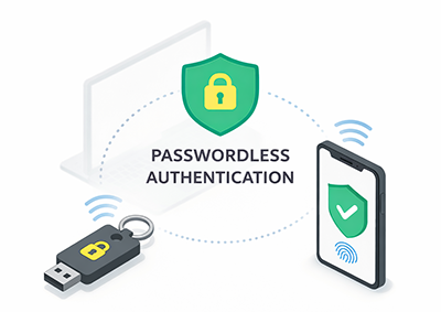 パスワードを使わず、物理キーやスマートフォンで本人確認を行う方式です。